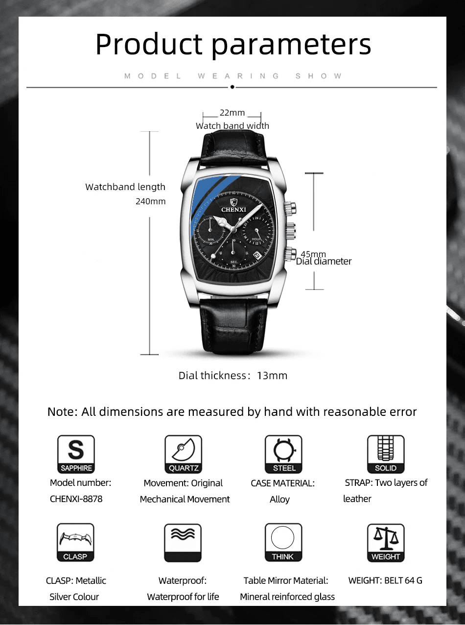 The CHENXI 909 Classic Square Dial Watch is not just a fashion accessory—it’s a statement piece built for confidence, class, and long-term use.