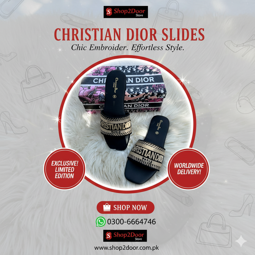 Made from premium materials, these Dior flat slippers feature exquisite embroidery that mirrors the original Christian Dior design, giving you that same luxury appeal at an affordable price. Each pair is crafted to perfection, ensuring long-lasting wear, soft inner comfort, and a chic finish. The flat sole design provides superior balance and ease, making them perfect for daily wear, casual outings, or even semi-formal events.
