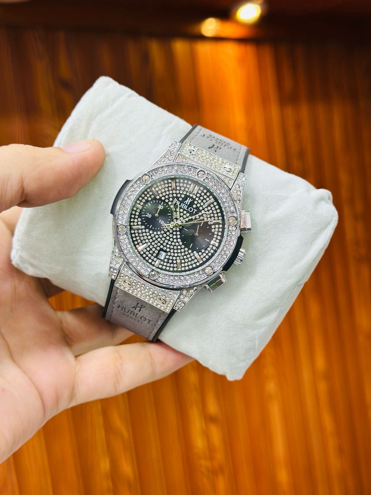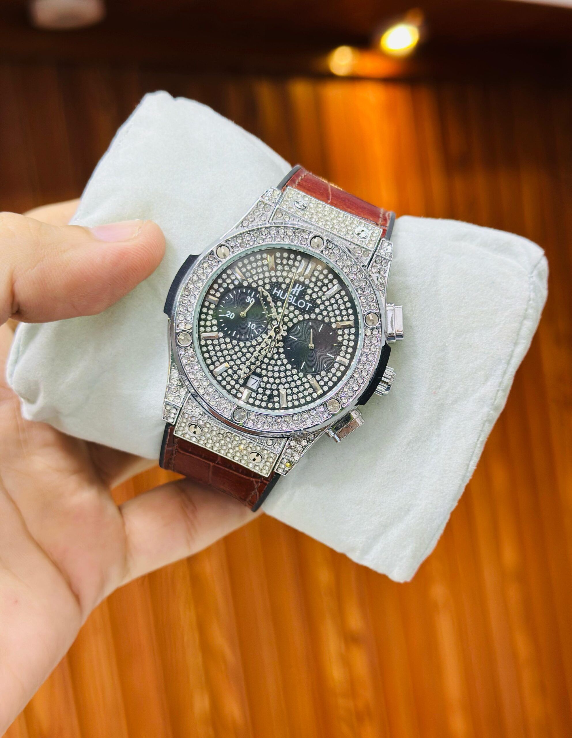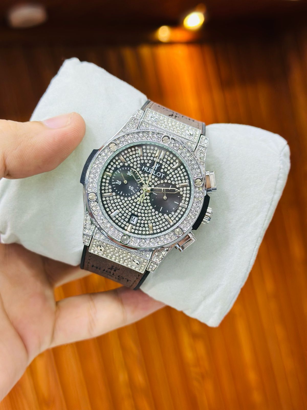 Shine brighter with the HUBLOT Stone Case Watch Replica, featuring a dazzling full-stone bezel case, premium leather strap, and fully working chronograph and stopwatch functions. Designed with attention to detail, this luxury-inspired replica is perfect for those who love to make bold style statements.